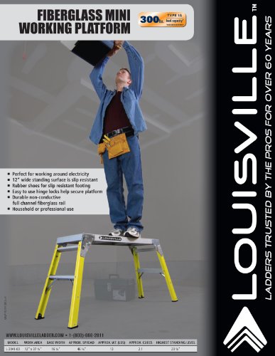 If you are an electrician, a heating and air-conditioning professional, a mechanical contractor, a residential handyman, or a DIY homeowner, this Louisville Ladder mini working platform is all you need to quickly and safely reach low and medium heights. This platform is also great for completing household tasks; it's perfect for doing framing projects or any painting project around the house. The Louisville Ladder mini working platform is very light to carry--it weighs only 13 pounds--and it folds easily and compactly for safe and convenient storage. This platform has durable non-conductive full-channel fiberglass side rails, making it ideal to work near electrical circuits. Three-hundred-pound weight capacity: People are amazed to find that this lightweight platform is rated with a Type IA duty rating that allows for a 300-pound load. Twelve-inch-wide standing surface: The Louisville Ladder mini working platform has a 12-inch-wide slip-resistant aluminum standing surface. Slip-resistant rubber feet: This mini platform has four slip-resistant rubber feet to allow for safe and easy use on any surface.